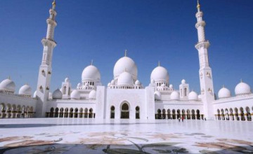 【谢赫扎耶德清真寺】(主殿不对外开放) 建筑及设计壮观华丽无与伦比,令人惊叹,拥有世界最大的地毯,及最多吊灯的清真寺);该清真寺耗资五十五亿美元,内部以数以万计的宝石贝壳镶嵌,具欣赏价值的是每盏80万美金的斯洛华世奇水晶吊灯,还有全世界最大的一块手工地毯,整个建筑群都用来自希腊的汉白玉包裹着,白色典雅的外观,衬在蔚蓝的天空下,显得格外庄严肃穆 (约 40分钟) 。